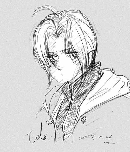 国家試験(?)を受ける頃のエドって感じですか?コノ顔じゃぁ。 これでも頑張って描いたんですが、どうやってもおこちゃまになってしまいます。 きっとアル(ヒト体)だったら反対に大人ちっくなるんではないかと…無理か? 3頭身か、ギャグか、子供しか描けないって情けなぁ。だからヒューズが描けないんだわ。とほほぉ。