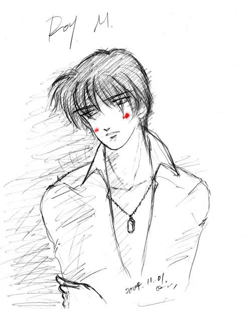 ちょっとアンニュイ(笑)なロイを描いてみました…。が、平ちゃんとどう違うのか? つまり書き分けが全く出来てないってこって…。しくしく。 だから、今までハガレンキャラを描かなかったのになぁ。 ちなみに、ヒューズはギャグ顔しかかけません。 なので、イベントパンフのカットは全てギャグ。本の内容と真逆ですわ。ほほほ。